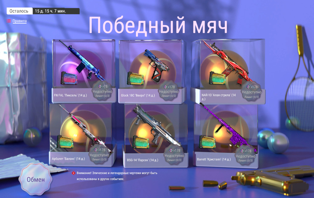 На странице события можно открывать ячейки с мячами за Виртуальные монеты. Каждую ячейку можно открыть три раза и получить из нее соответствующий чертеж и временную версию оружия. Дубликаты временных пушек суммируются по сроку. Чертежи можно обменять на странице события на соответствующее оружие. Эпические и легендарные чертежи также могут быть использованы в других событиях после завершения ивента "Победный мяч", поэтому не спешите удалять их со склада.