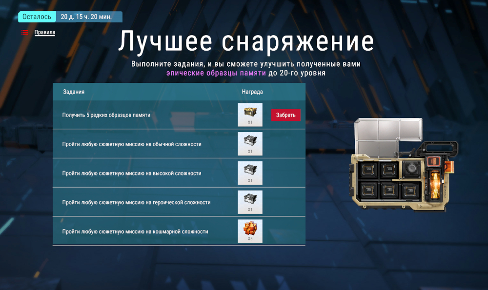 Начав данное событие, ты получишь 5 эпических образцов памяти "Перспектива". Выполняй задания, чтобы получить предметы, нужные для повышения уровня образцов. Завершив все задания, ты сможешь улучшить образцы памяти до 20-го уровня.