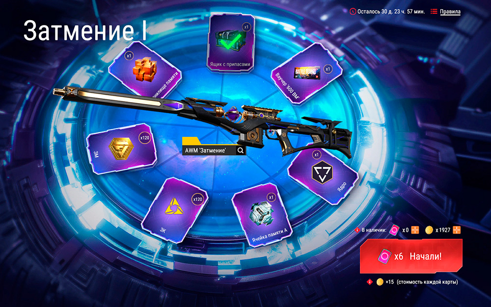 Во время события можно приобретать карты "Затмение" по 15 особых монет за штуку. Эти карты позволяют выигрывать призы, представленные на внешнем круге страницы ивента. Каждый приз игрок получает только один раз. С каждой попыткой количество необходимых карт увеличивается. После получения всех призов можно забрать легендарную снайперскую винтовку AWM "Затмение".