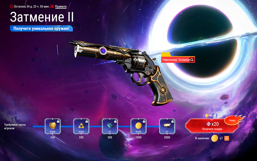 Заплатив 20 Виртуальных монет в событии, ты разблокируешь скидка на покупку уникального револьвера (от 10% до 100%). Базовая цена револьвера составляет 3380 особых монет, которые используются в событиях. Награды, указанные на горизонтальной шкале, можно будет получить после того, как револьвер "Затмение" в рамках данного события приобретет указанное количество игроков.
