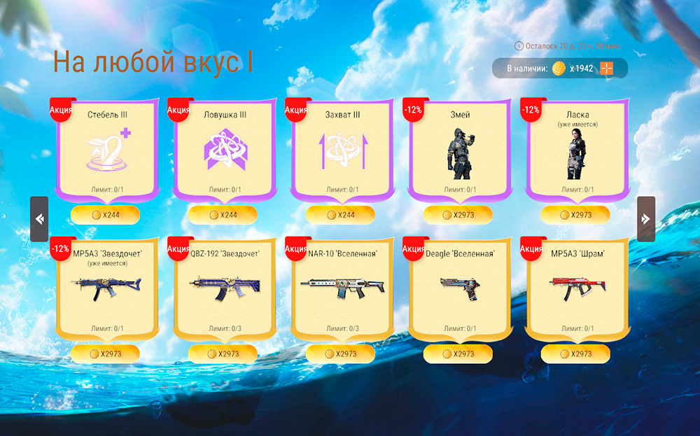В данном событии можно приобрести со скидкой разнообразные полезные предметы за специальные ивентовые монеты, которые можно купить за ВМ по курсу 1 к 1. Среди предложений можно найти различные усилители для кристаллов навыка "Сфера", "Капкан", "Росток" и "Вьюга", оружие серии "Звездочет", "Вселенная", MP5A3 "Шрам", персонажа "Змей" и облик "Ласка". С полным списком предметов можно ознакомиться на странице события.
