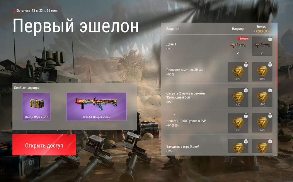 Играй в PvP и PvE-режимах, выполняй задания и получай призы! За 500 Золотых монет можно открыть доступ к бонусным наградам, среди которых находится эпический дробовик BSG-14 "Покровитель".