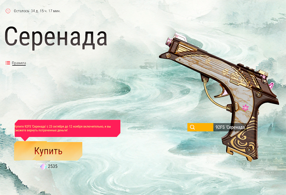 С 23 октября 12 ноября включительно приобрети крутой пистолет легендарного качества 92FS "Серенада" за 2535 Виртуальных монет, а затем получай потраченные ВМ обратно. Для этого нужно заходить в игру 7 дней с 13 по 26 ноября: