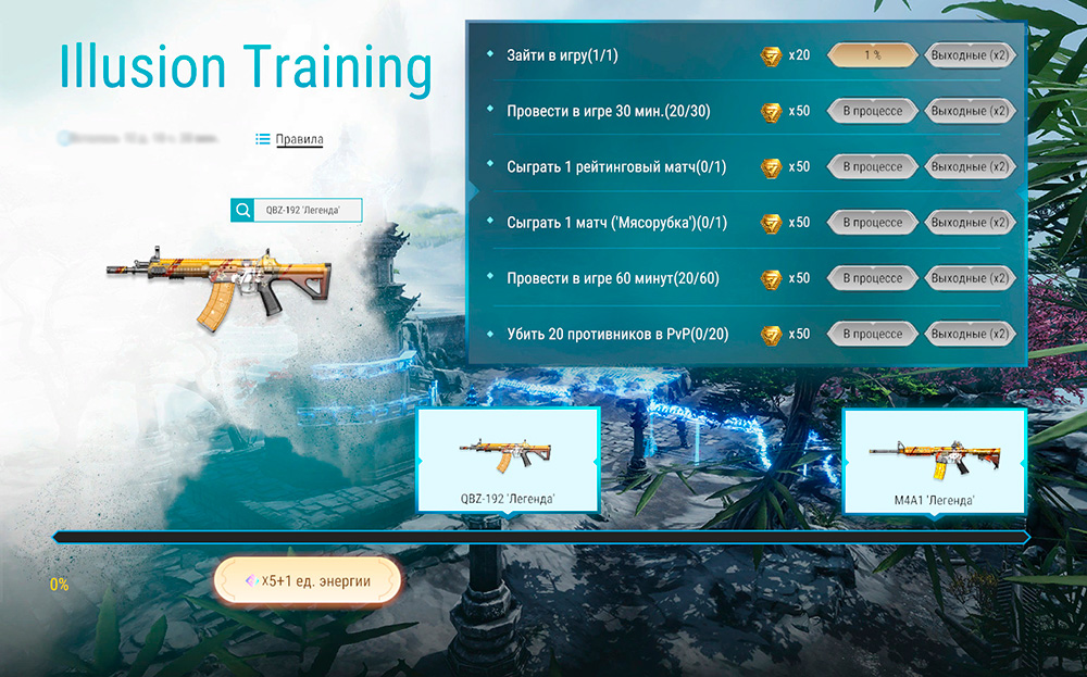 Заходи в игру, выполняй задания и забирай Золотые монеты и очки энергии. В выходные количество получаемых очков увеличено вдвое. Очки энергии также можно купить (5 ВМ за единицу энергии). Заполнив шкалу энергии на 50%, ты сможешь штурмовую винтовку QBZ-192 "Легенда". Заполнив шкалу целиком, тебе достанется M4A1 "Легенда".