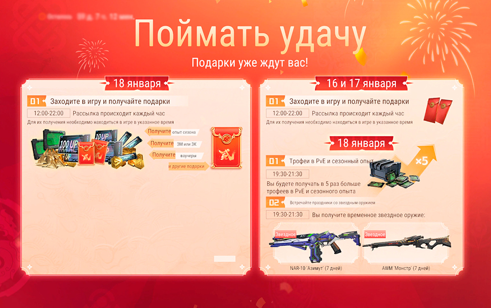 18 января с 19:30 до 21:30 мск будет в пять раз увеличено количество получаемых трофеев во PvE, а также количество сезонного опыта. Также зайдя в игру 18 января с 19:30 до 21:30 мск, ты получишь на почту набор "Звездное оружие", из которого можно выбрать NAR-10 "Азимут" на 7 дней или AWM "Монстр" на 7 дней.