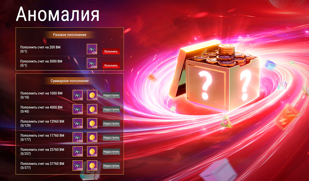 Пополняй счет и получай награды! Единовременно пополнив счет на 200 и 3000 ВМ, в подарок достанутся, соответственно, 200 и 3960 ВМ. Прочие награды выдаются за суммарное пополнение счета на указанные суммы. В это случае ты будешь получать не только ВМ, но и особые монеты, которые используются событиях.