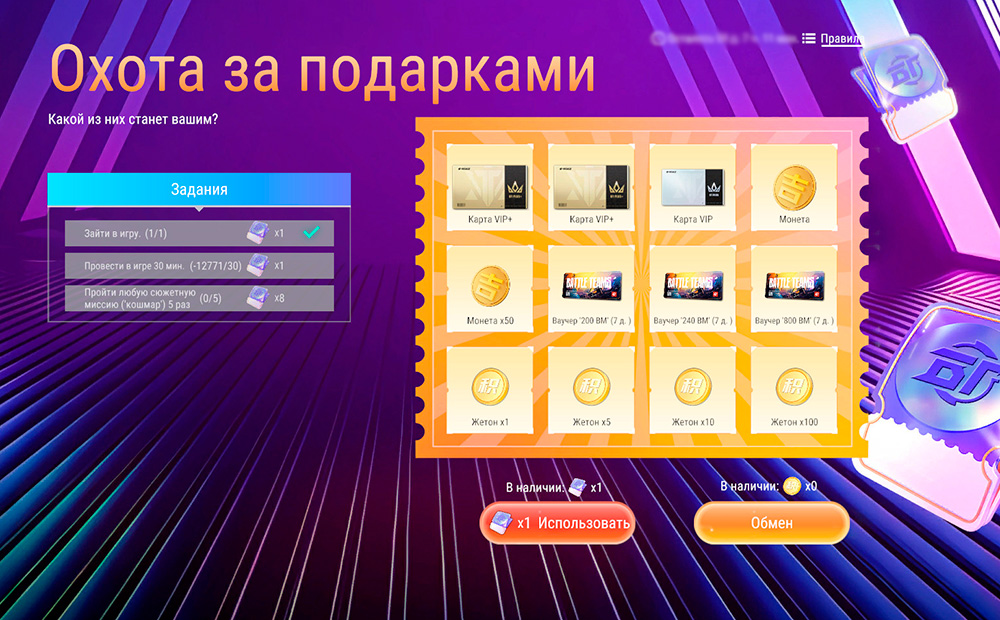 Заходи в игру, выполняй задания и получай в награду специальные билеты, которые позволят принять участие в розыгрыше призов. В нем можно получить VIP-карту, ваучеры на ВМ и специальные жетоны. Жетоны в свою очередь также можно обменять на различные награды на странице события. Сделать это нужно до его завершения.