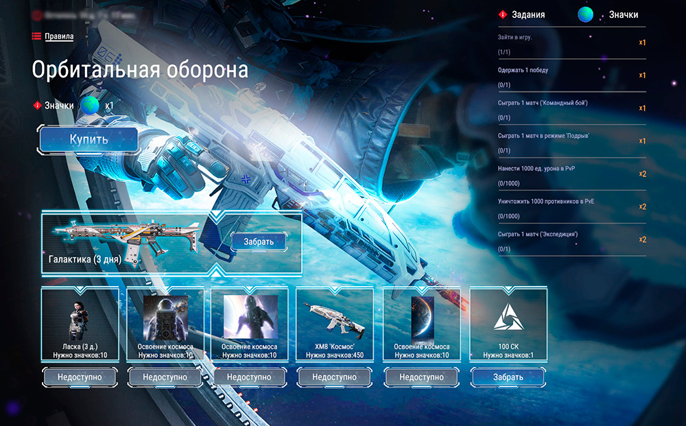 Выполняй задания и получай в награду специальные значки Орбитальной обороны. Максимальное количество, которые можно получить за выполнение заданий — 140 штук.