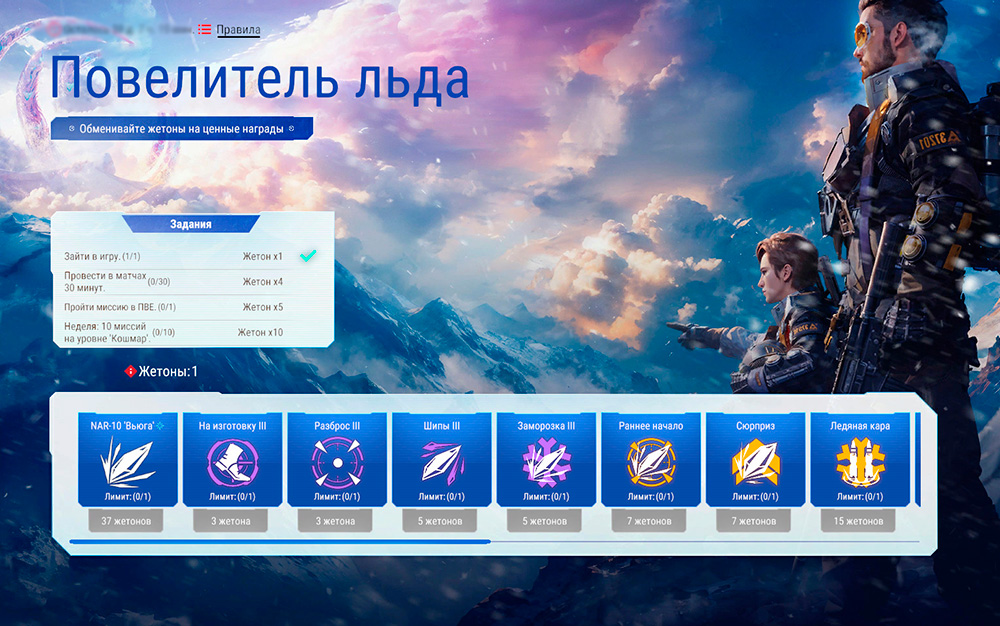 За выполнение миссий на странице события ты будешь получать ледяные жетоны. Эти жетоны можно обменять на различные награды: кристалл навыка NAR-10 "Вьюга", образцы памяти и усилители для него. Каждую награду можно получить указанное количество раз.