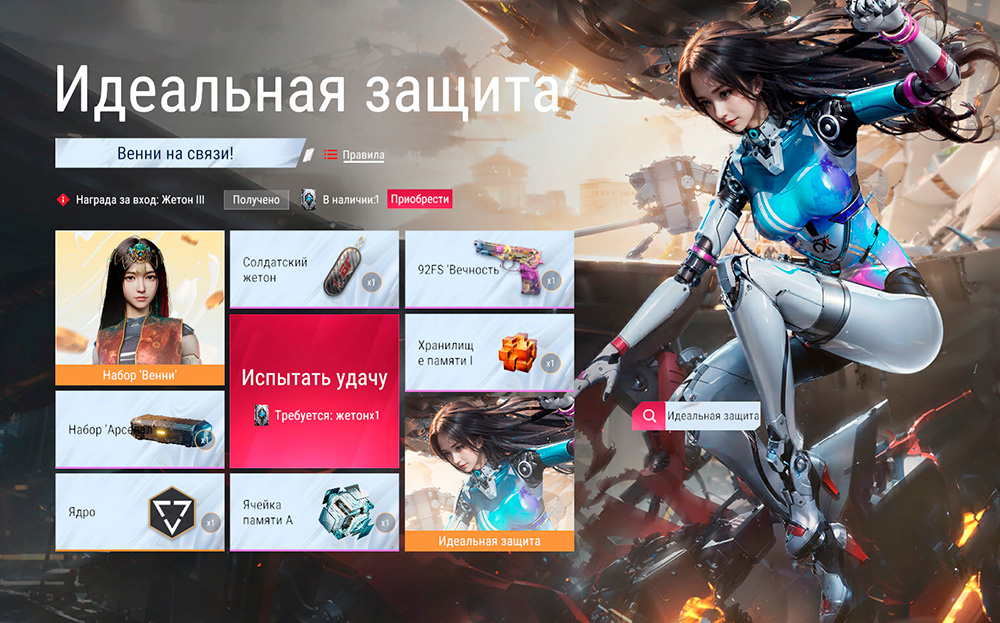 При первом входе в игру во время события ты получишь один бесплатный жетон, который позволит выиграть один из призов. При первой попытке откроется брелок "Солдатский жетон", каждая следующая попытка требует больше жетонов, чем предыдущая. Главные призы события – облик "Идеальная защита" и набор "Венни" – достанутся в последнюю очередь.