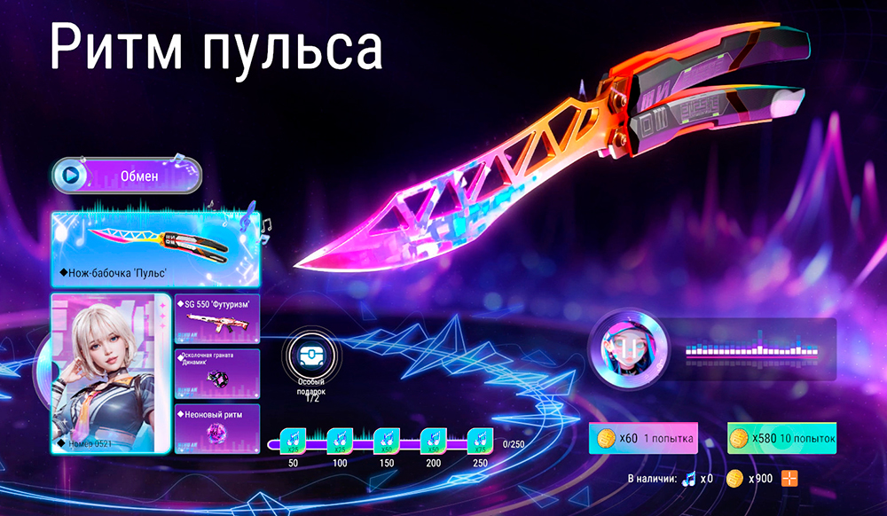 Также на странице события можно получить особый подарок – аватар "Неоновый ритм" и эксклюзивную рамку. Данный подарок станет доступен после получения ножа-бабочки "Пульс" и осколочной гранаты "Динамик".