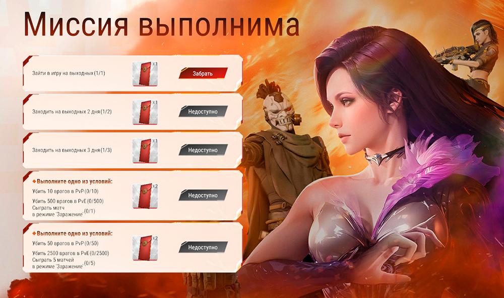 15 февраля с 19:30 до 21:30 мск будет в пять раз увеличено количество получаемых трофеев во PvE, а также количество сезонного опыта. Также зайдя в игру 25 декабря с 19:30 до 21:30 мск, ты получишь на почту звездное оружие NAR-10 "Азимут" на 7 дней и AWM "Монстр" на 7 дней.