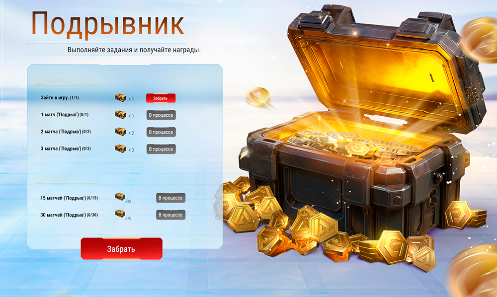Выполняй задания события и получай в награду наборы участника. Открой набор на складе в разделе "Предметы", чтобы случайным образом получить награду, среди которых снежинки, ЗМ или СМ, а также наборы "Арсенал". Наборы участника будут храниться на складе и после завершения события.