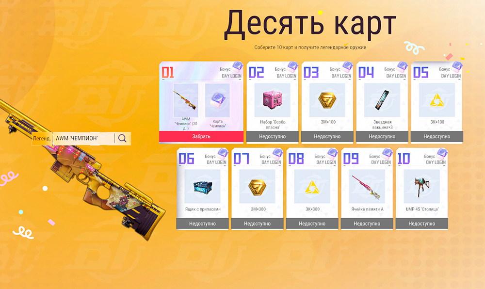 Заходи в игру и собирай специальные карты вместе с наградами. Собрав 10 карт, ты сможешь использовать их, чтобы превратить временную версию легендарной снайперской винтовки AWM "Чемпион" в постоянную.
