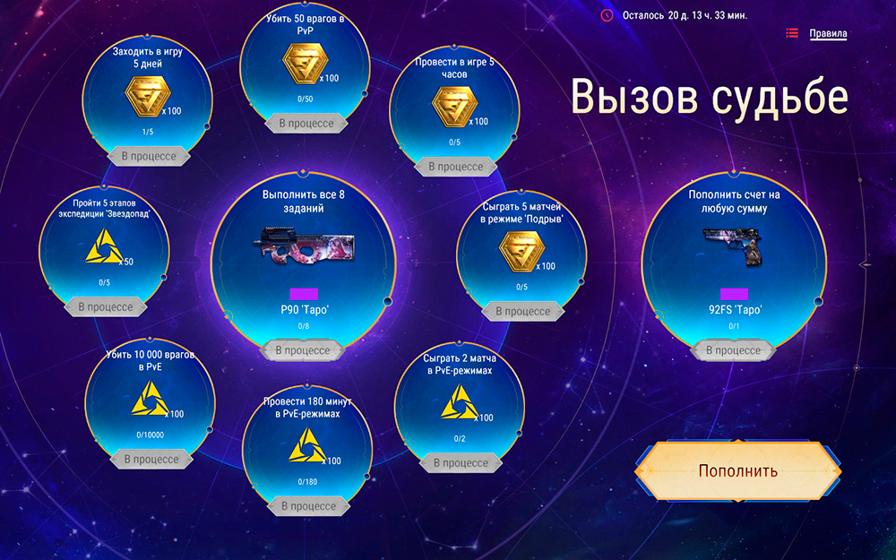 Выполняй задания и получай награды! За выполнение всех 8 заданий ты получишь главный приз — пистолет-пулемет P90 "Таро". Пополнив счет на любую сумму, ты получишь эпический пистолет 92FS "Таро".