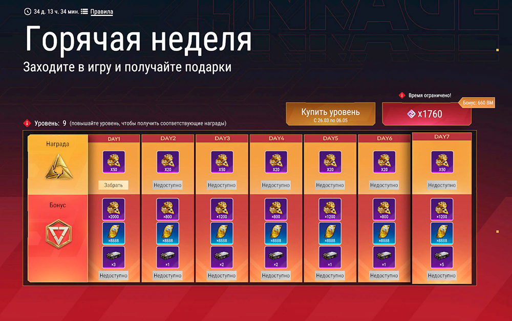 Заходи в игру на протяжении 7 дней и получай в подарок Звездные кристаллы. Повышая свой уровень в рамках события за Виртуальные монеты, ты сможешь разблокировать бонусные награды: Звездные кристаллы, очки опыта сезона и наборы "Диссоциаторы". Для получения бонусных наград также необходимо заходить в игру указанное число дней.