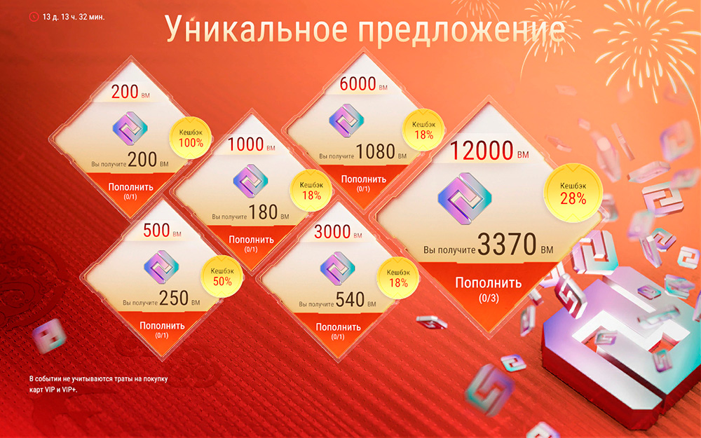 Потратив указанное на странице ивента количество ВМ, ты получишь в подарок набор "Кешбэк". Внутри каждого можно найти либо от 24 до 46 ЗМ, либо от 24 до 46 ЗК. Открыть имеющиеся наборы нужно до завершения события.