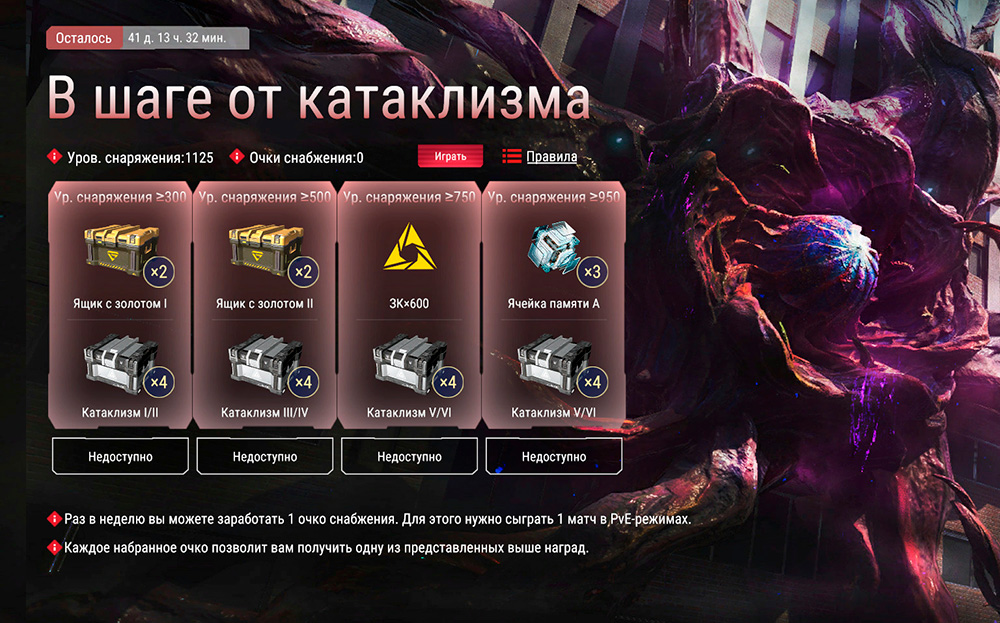 Событие для поклонников PvE, которое поможет в подготовке к битвам с самыми опасными противниками. Достигни нужного уровня снаряжения и играй PvE-матчи, чтобы получать очки усиления (одно очко можно получить один раз в неделю).