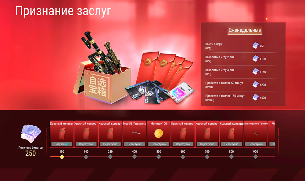 Обращаем ваше внимание, что на странице события отображается количество билетов, полученных за все время. В текущем событии они не будут засчитываться на горизонтальной шкале с наградами. Второй "Красный конверт" на ней будет выдаться при получении 200 билетов.